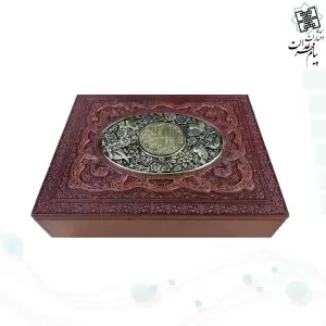 قرآن وزیری گلاسه چرم جعبه لپتاپی پلاک فلزی طرح مس نفیس