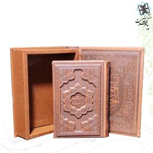 قرآن جیبی چرم قهوه ای جعبه دار پلاک رنگی نفیس