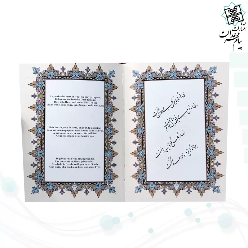 کتاب رباعیات خیام (چهار زبانه) اثری فاخر از اشعار فیلسوف و شاعر بزرگ ایرانی، خیام نیشابوری، است. این نسخه با طراحی جیبی، جلد چرمی شکیل و قاب کشویی زیبا عرضه شده و شامل ترجمه رباعیات به چهار زبان (فارسی، انگلیسی، فرانسه و آلمانی) است.