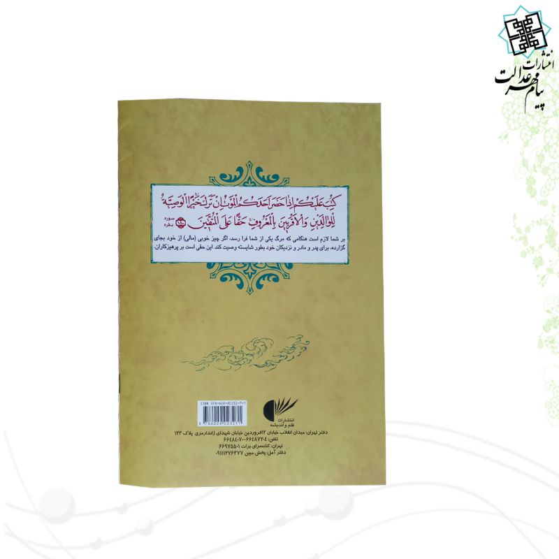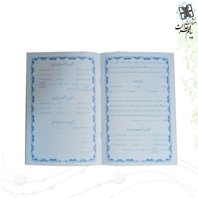 دفترچه وصیت نامه از نوع رقعی می باشد , که نوع جلد آن شومیز ، نوع کاغذ این دفترچه از جنس تحریر با کیفیت خوبی است . این دفترچه شامل 16 صفحه و با ابعاد (14.5 در 21.5) با وزنی معادل 32 گرم می باشد .