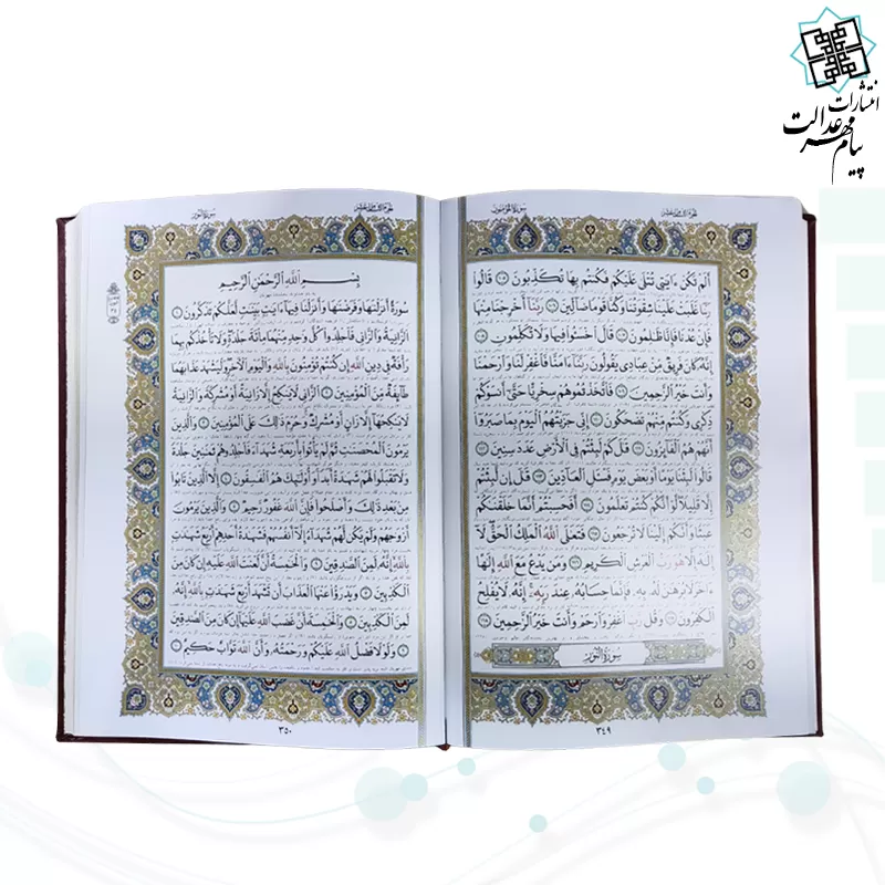 این محصول زیبا و نفیس قرآن کریم از نوع وزیری می باشد , که نوع جلد آن چرم مصنوعی با طراحی بسیار زیبا و به صورت لپتاپی باز شو است , نوع کاغذ این کتاب مقدس از جنس گلاسه با کیفیت خوب بوده , که به همراه 2 گلدان مسی فیروزه , زیبایی و شکوه خاصی به این محصول بخشیده است . این کتاب مقدس شامل 604 صفحه و با ابعاد(17.5 در 23.5) و جعبه کامل این ست در ابعاد(30.5 در 42)با وزنی معادل 5.46 کیلو گرم می باشد .