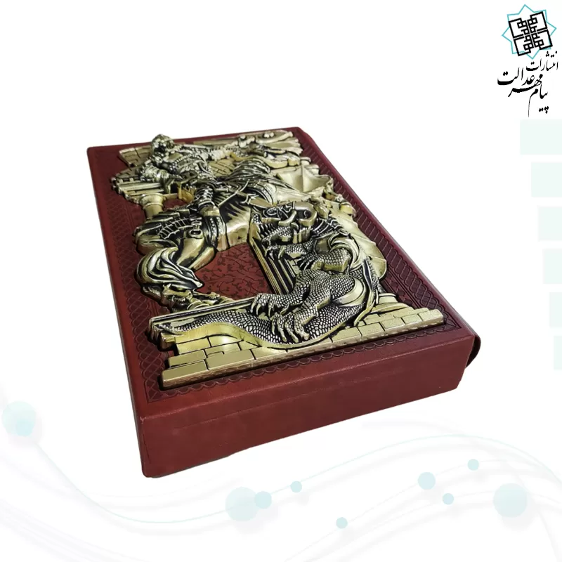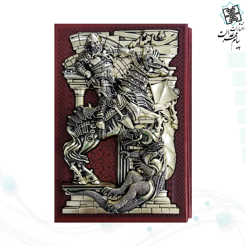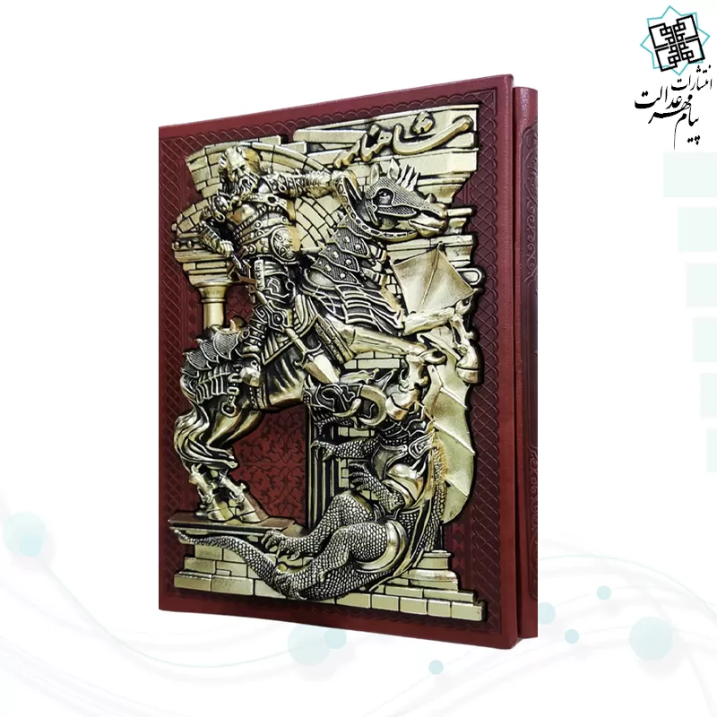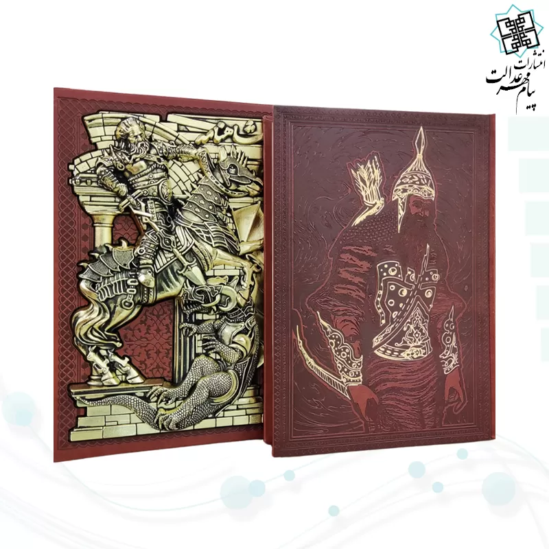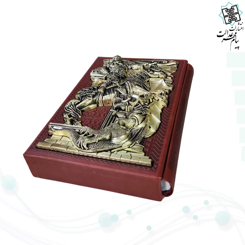 شاهنامه نفیس چاپ وزیری با صفحات گلاسه، جلد چرمی با طرح مس و قاب کشویی شکیل، مناسب برای علاقهمندان به ادبیات کهن ایران و مجموعهداران آثار فاخر.