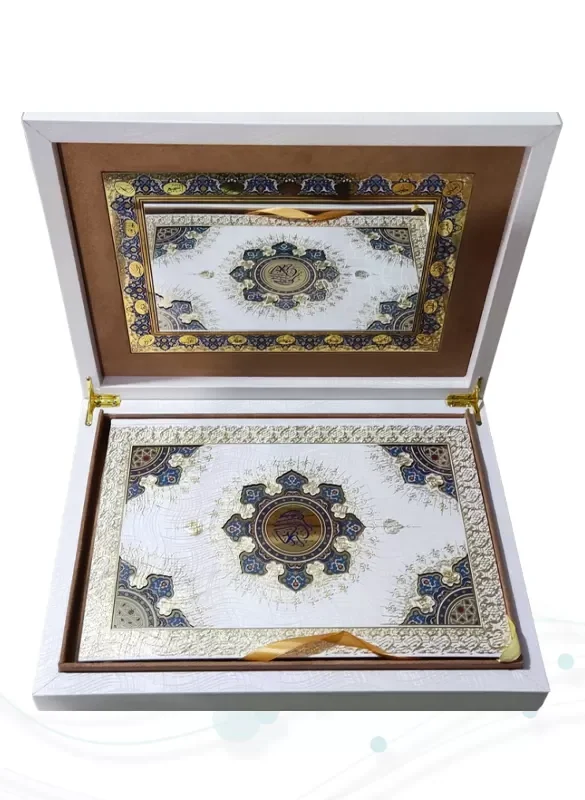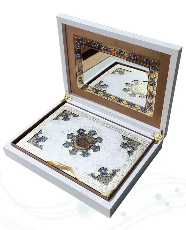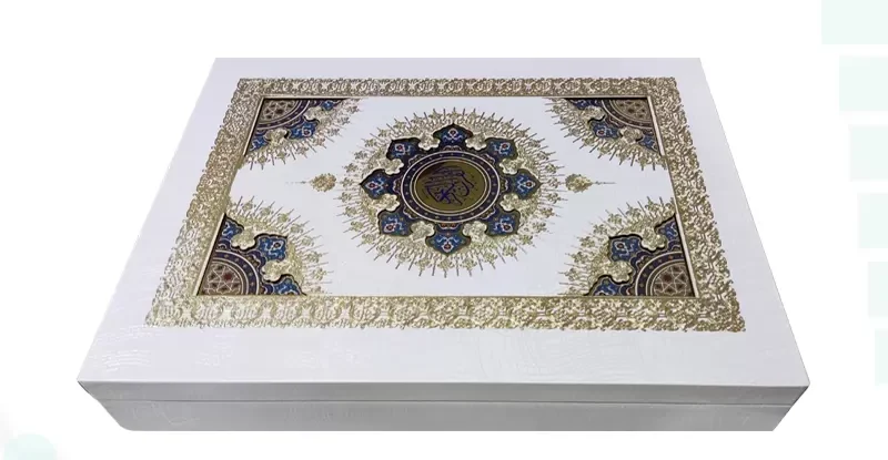 قرآن کریم معطر با رایحهای روحبخش که در بافت کاغذ نفوذ کرده، همراه با چاپ نفیس، جلد گالینگور سفید و جعبه لپتاپی شکیل، انتخابی عالی برای هدیه و ختمهای قرآنی.