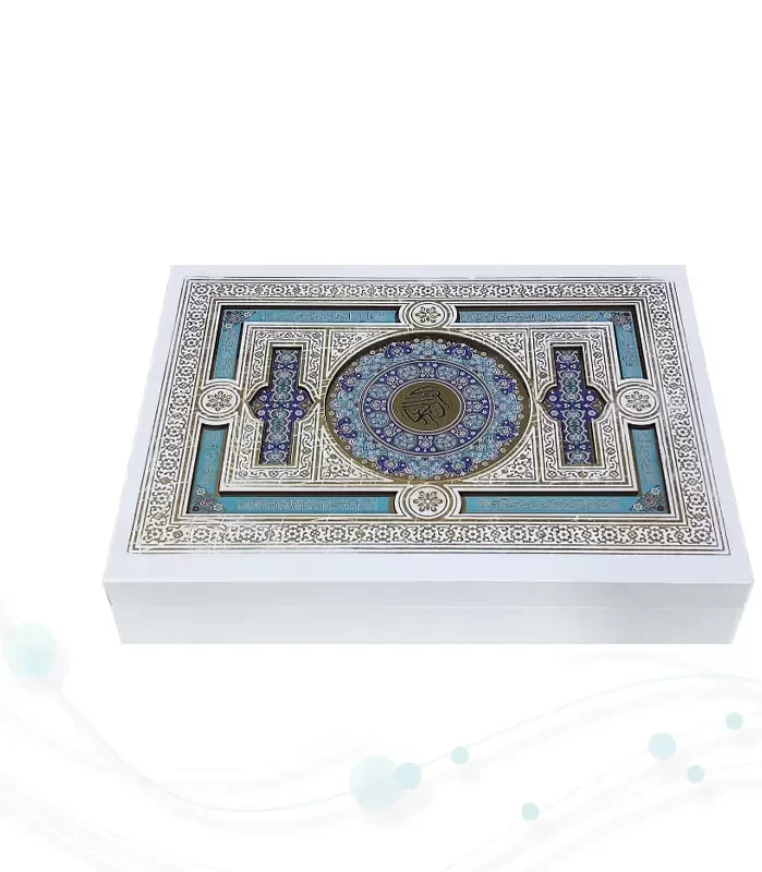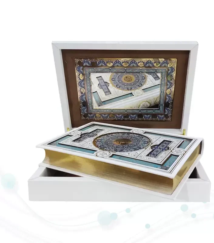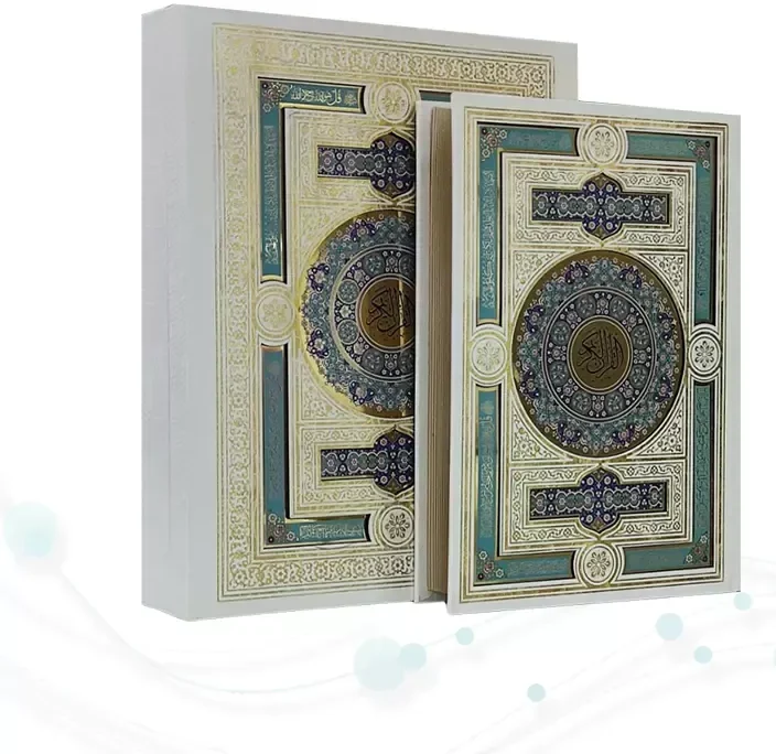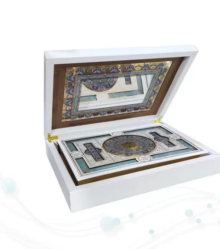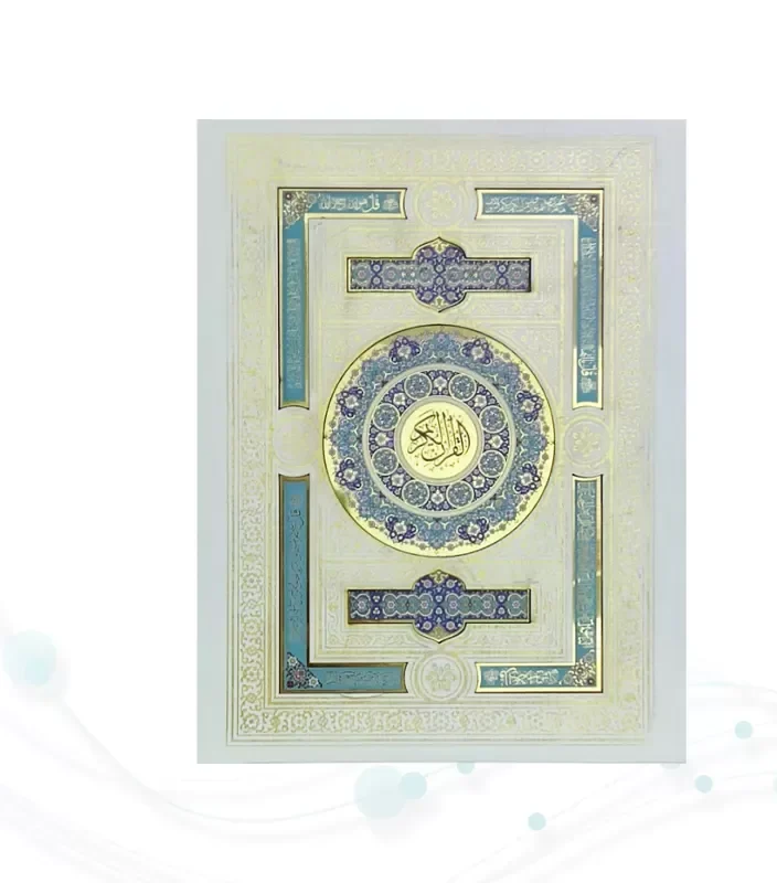 این محصول زیبا و نفیس قرآن کریم از نوع وزیری می باشد , که نوع جلد آن گالینگور سفید به همراه پلاک و داخل قاب آینه دارد و با طراحی بسیار شیک زیبا کار شده است , نوع کاغذ این کتاب نفیس از جنس گلاسه است . این کتاب زیبا شامل 604 صفحه با ابعاد (18 در 24) و ست کامل این محصول زیبا با ابعاد (21 در 27.5)با وزنی معادل 2.518 گرم می باشد .
