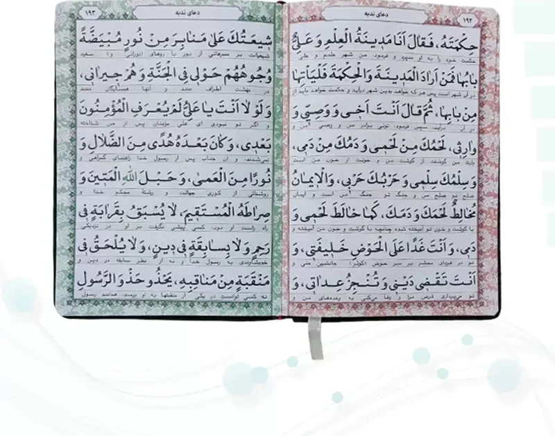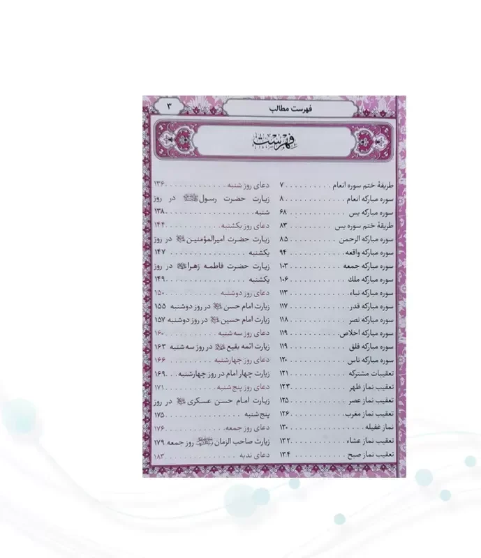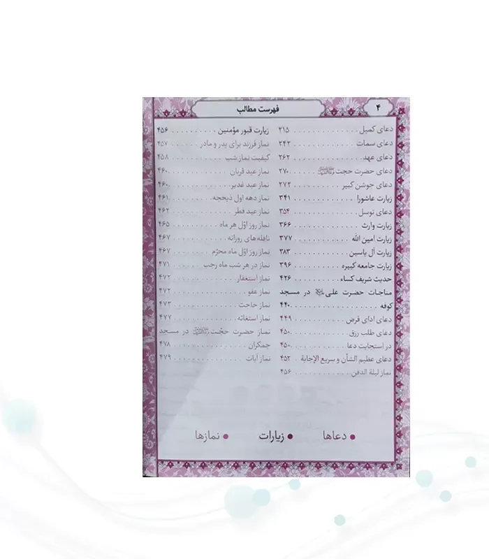 این کتاب شامل منتخبی از دعاها، زیارات و اعمال پرفضیلت مانند دعای توسل، کمیل، زیارت عاشورا و… است که با طراحی گرافیکی رنگی در صفحات داخلی چاپ شده است.