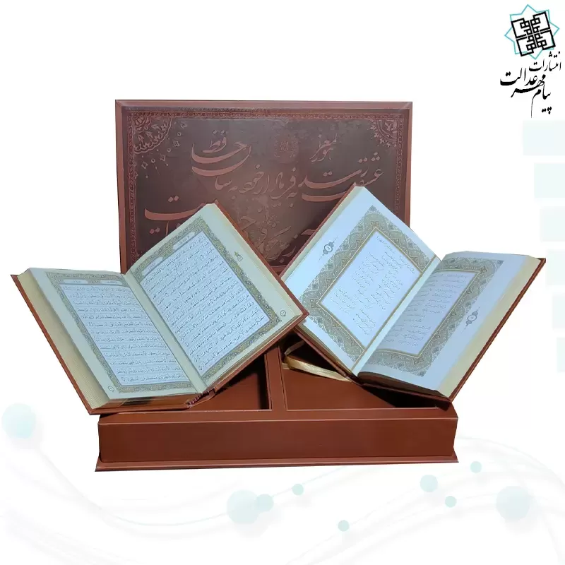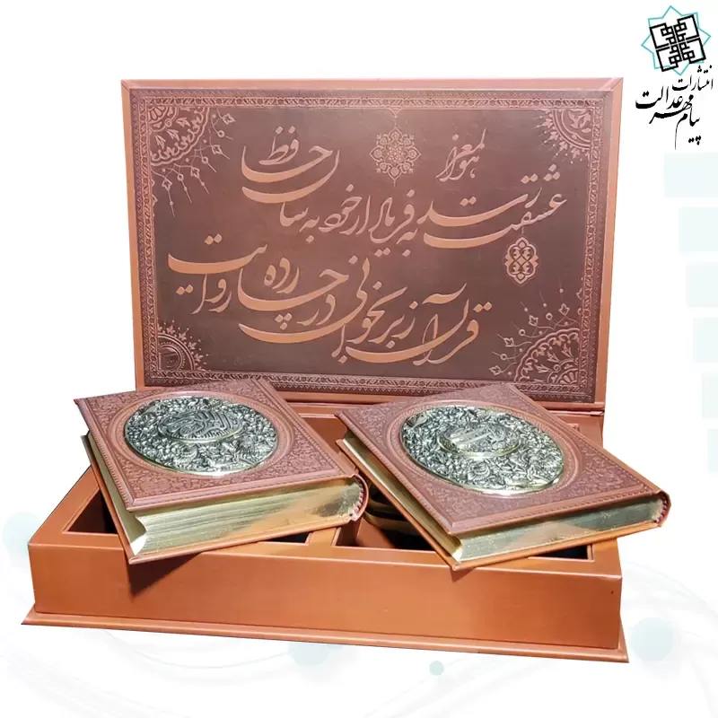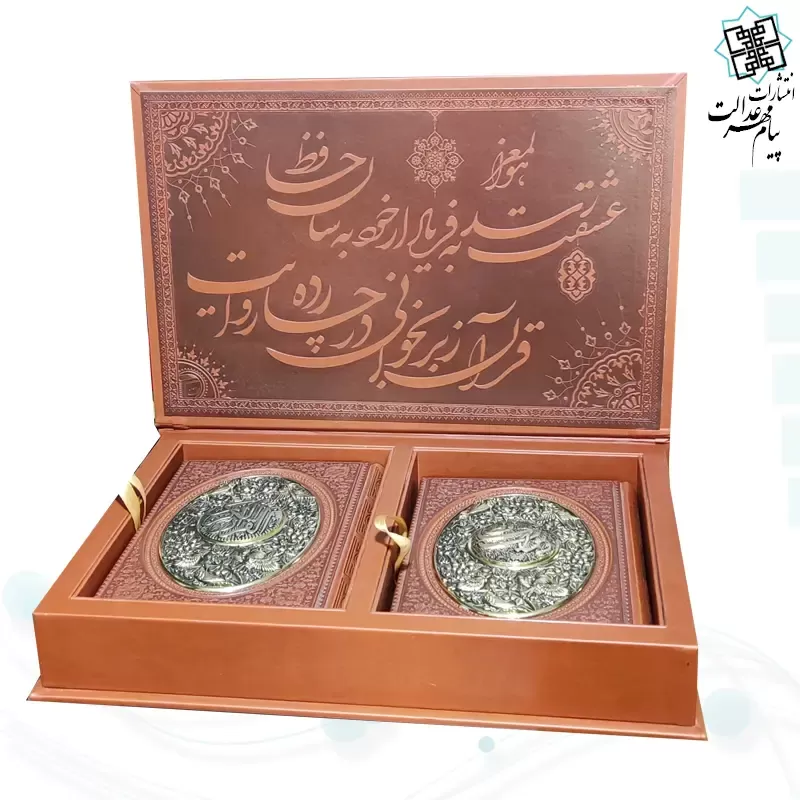 این محصول زیبا و نفیس 2 جلدی (قرآن و حافظ) از نوع وزیری می باشد , که نوع جلد آن چرم مصنوعی برجسته طرح مسی با طراحی بسیار زیبایست , نوع کاغذ این کتاب گلاسه با کیفیت خوبی است . این محصول زیبا شامل قرآن 604 و حافظ 416 صفحه و با ابعاد (18 در 24) با وزنی معادل 5090 گرم می باشد .